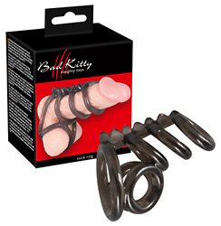 Rauchfarbener Penis-Hoden-Ring mit ingesamt sechs Ringen, die an einem genoppten Steg befestigt sind. Ein Ring ist für den Hodensack, die beiden darunter liegenden für die einzelnen Hoden und die drei weiteren für den Penisschaft. Steg ca. 7 cm lang. Ring-Dicke 0,8 cm. Ringe-Ø 4,1-2,2 cm (dehnbar). Material: TPE.